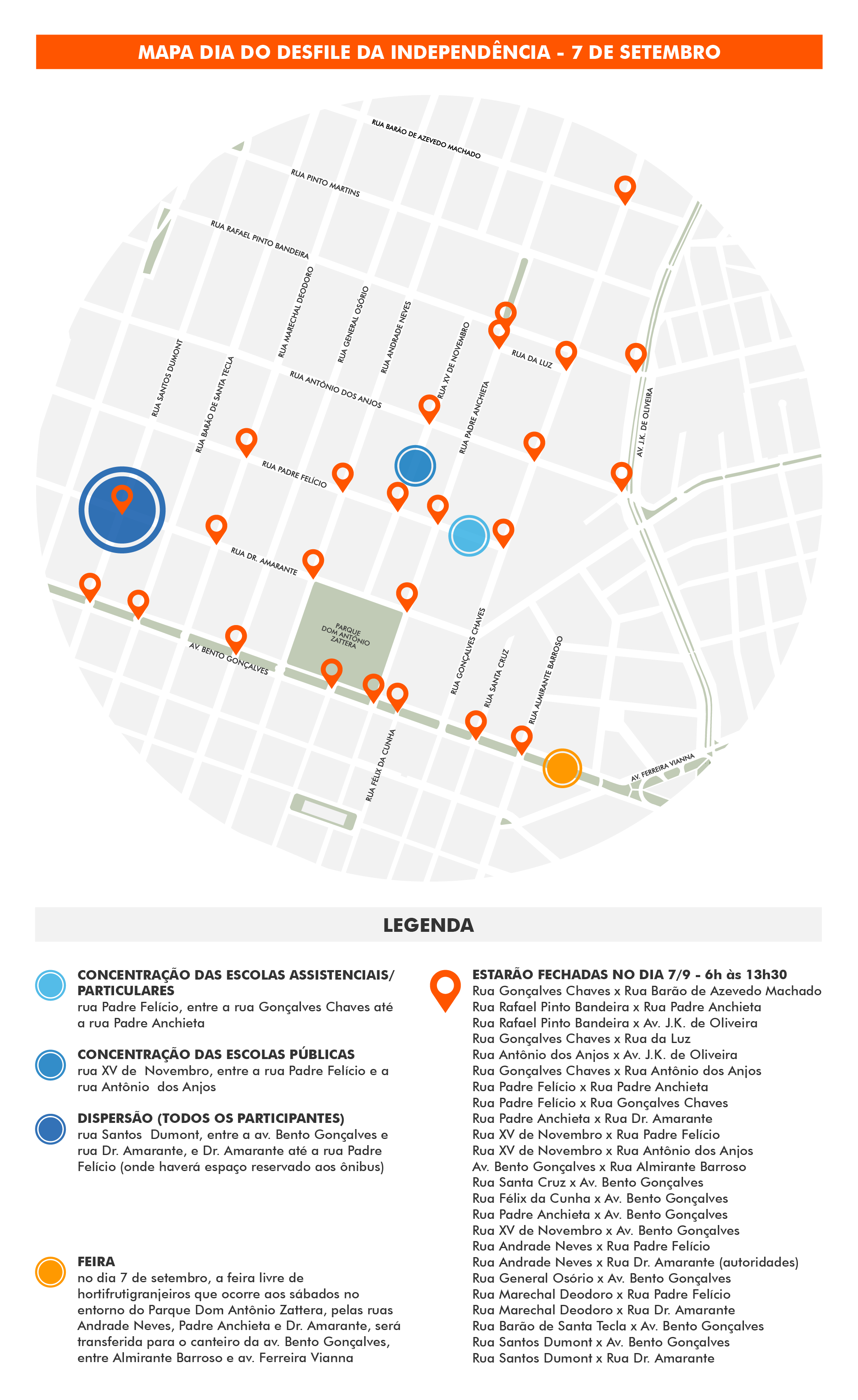 O mapa a seguir mostra todas as ruas que estarão fechadas na manhã de 7 de setembro, das 6h às 13h30min, devido ao desfile cívico-militar. Também indica os locais de concentração das escolas assistenciais/particulares e das escolas públicas e o ponto de dispersão de todos os participantes.