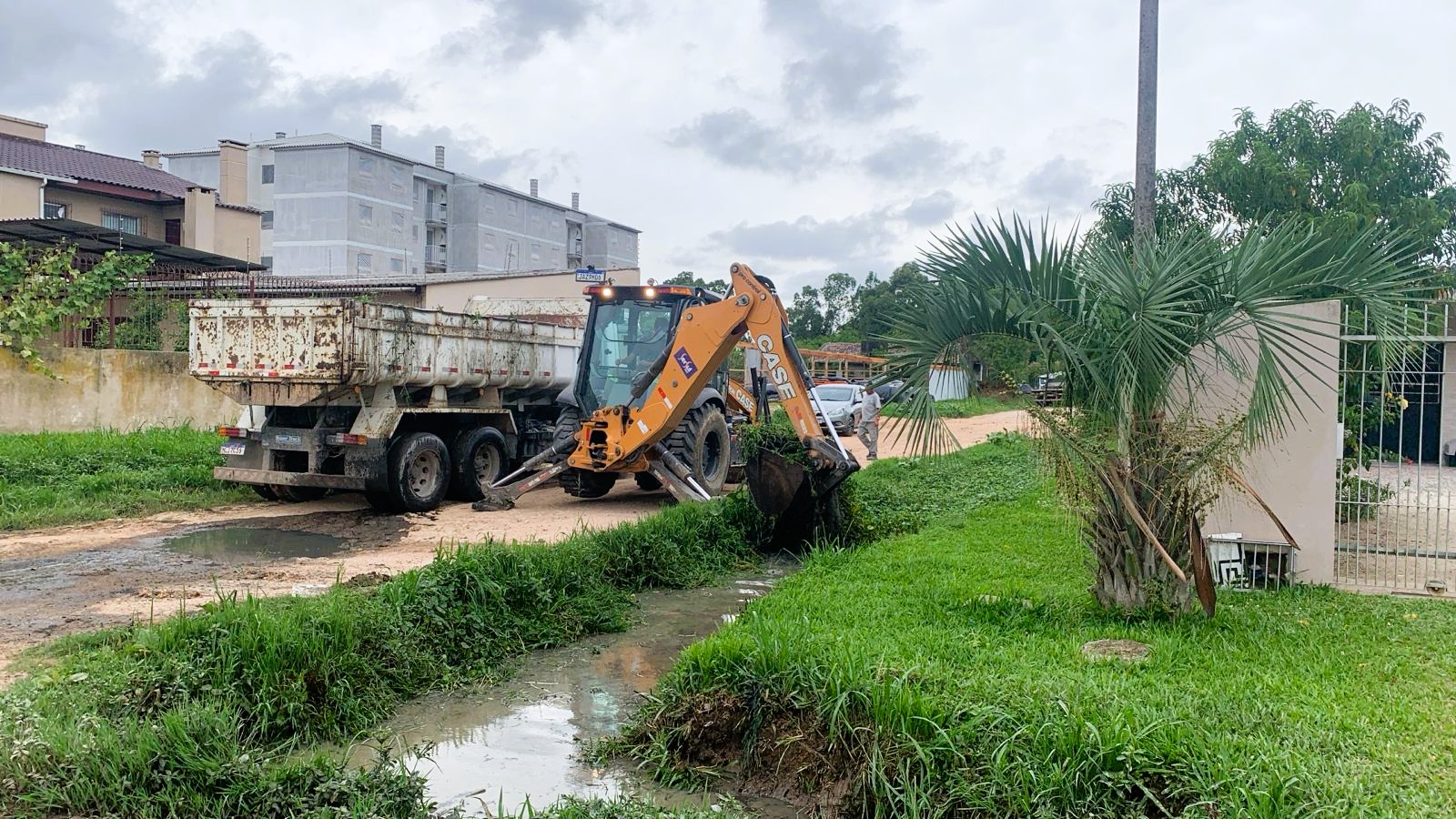 Retroescavadeira limpa valeta na rua Rudi Bonow, bairro Três Vendas, zona norte da cidade, nesta segunda-feira (15), quando também foram feitas outras intervenções de drenagem e ensaibramento na zona urbana do município