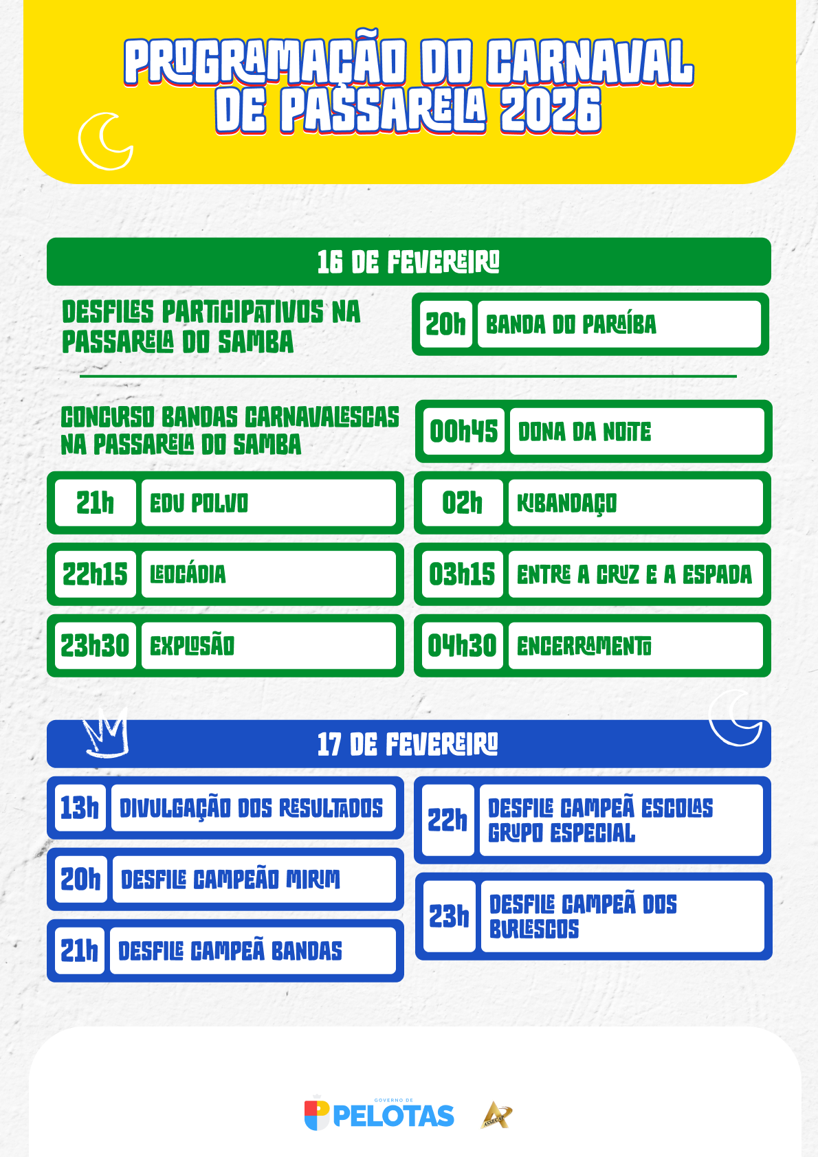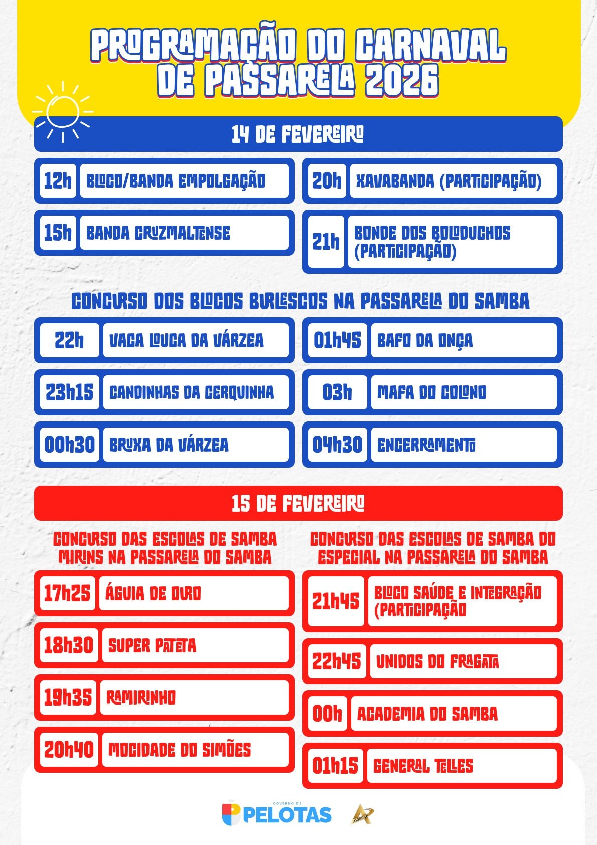O Carnaval de Pelotas na Passarela do Samba, que neste ano vai acontecer dentro do calendário nacional, começa neste dia 14 de fevereiro e se estende por 4 dias - contando com o desfile das campeãs. Desde o meio-dia de sábado até a madrugada de quarta-feira (18), 24 blocos, bandas e escolas de samba vão desfilar na estrutura preparada pelo Município na rua Conde de Porto Alegre, no bairro Porto. A Prefeitura reassumiu a realização da festa popular após 16 anos.