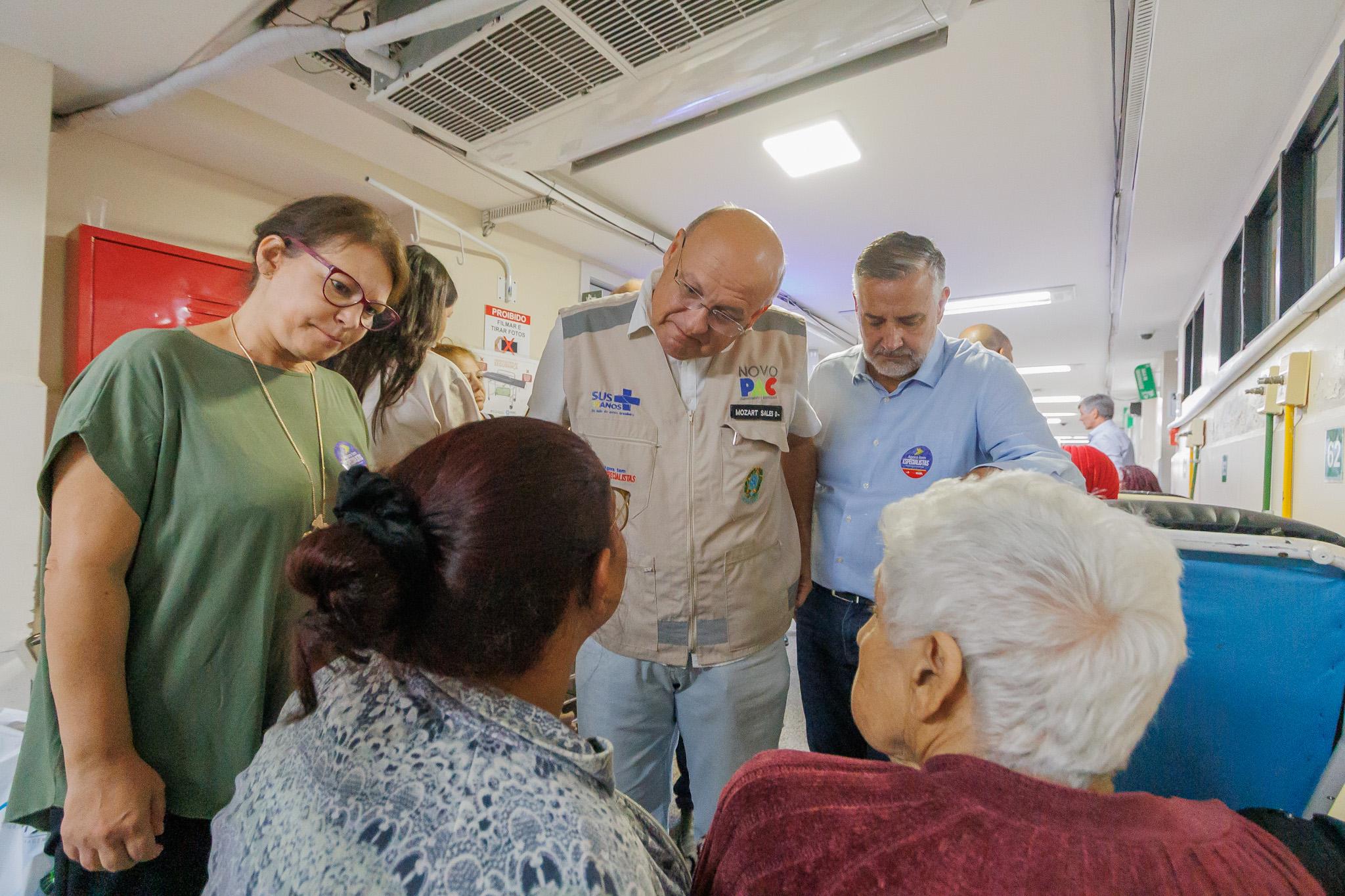 O executivo do Ministério da Saúde, Mozart Sales, com a secretária de Saúde, Ângela Moreira Vitória, e o deputado federal Paulo Pimenta, conversam com paciente e familiar durante visita ao PS na manhã deste sábado (21)