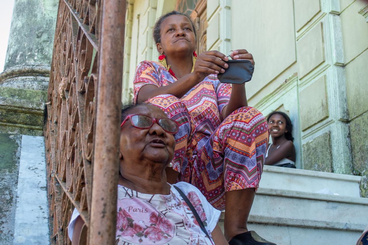 Márcia Dias, costureira e percussionista da escola de samba General Telles, com a mãe, Zeli, ex-baiana da escola, e uma das filhas, Taciane, no alto, aguardam desde quarta-feira a abertura da venda dos camarotes e mesas no Mercado Central para o Carnaval 2026 (Fotos: Manuela Santos/Secom)