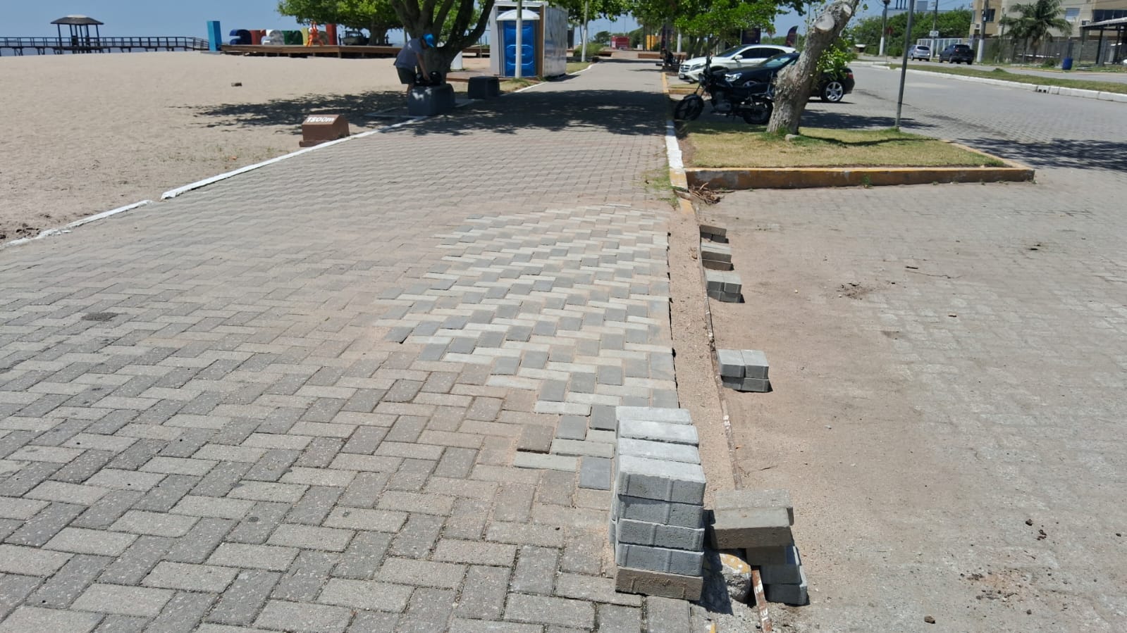 Uma terceira equipe do MOP deu seguimento aos reparos no calçadão da avenida da praia do Laranjal, balneários Valverde e Santo Antônio, de pedras de concreto.
