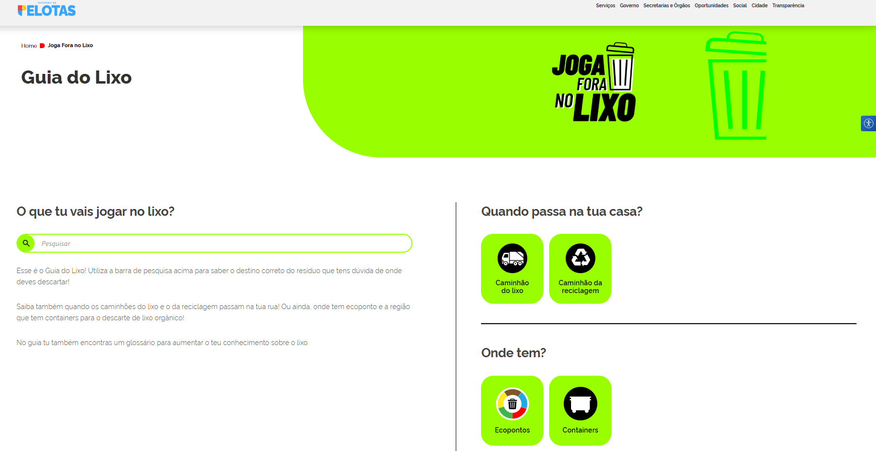 Ao acessar o site www.pelotas.com.br/lixo, o usuário encontra, no lado esquerdo, o menu “O que tu vais jogar no lixo?”, com um campo de pesquisa. Nele, é possível digitar o material desejado, por exemplo: papel, fruta, embalagem plástica ou móvel desmontado. Após a seleção, o sistema disponibiliza orientações completas sobre o descarte adequado. Abaixo, há um glossário com a explicação para cada termo importante no contexto de gestão de resíduos sólidos.