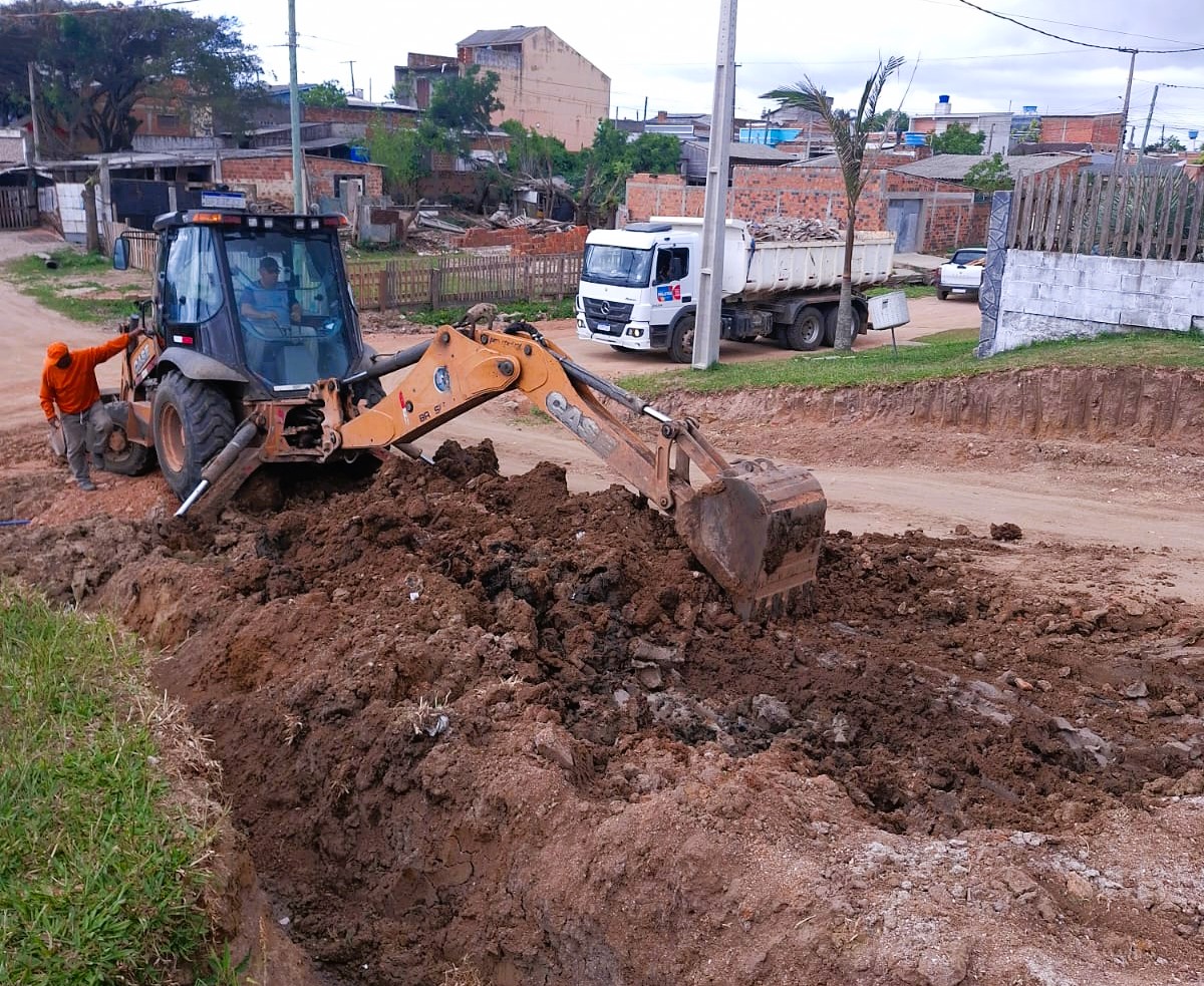 Retroescavadeira em operação na manhã desta quarta-feira (5) na rua Maximiliano Pombo Cirne, no Solar da Figueira, Areal Fundos, durante obra de ensaibramento e drenagem na região (Fotos: Divulgação/Ssui)