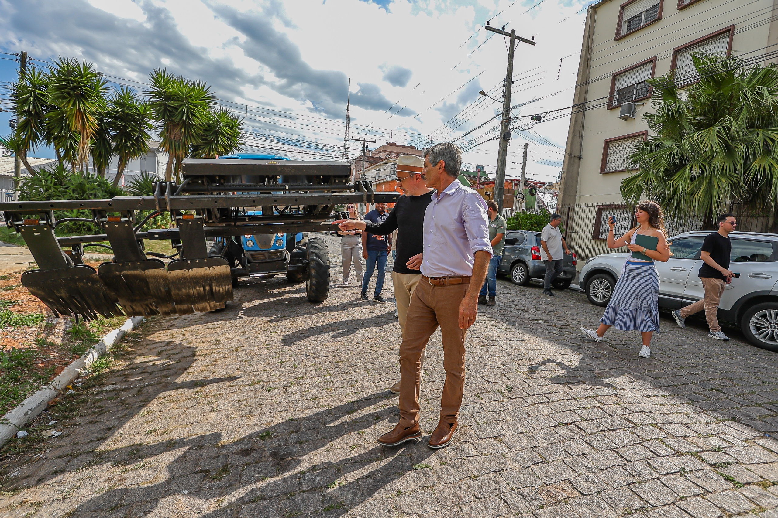 O prefeito Fernando Marroni observa o funcionamento da capina elétrica, equipamento colocado em teste nesta sexta-feira (28) na região da praça Palestina, área central de Pelotas (Fotos: Volmer Perez/Secom)